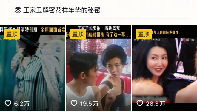 就目前在短视频平台中,官方账号置顶了3条高赞内容,分别是首次曝光的画面内容、早期的片场花絮,以及张曼玉的国际影响力。