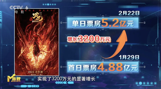 动画电影《哪吒之魔童闹海》国内外奇迹依旧。截至2月22日,影片单日票房奇迹般地攀升至5.2亿元,相较于上映首日的4.88亿元,实现了3200万元的显著增长,观影人次已达2.83亿,成为国民热议的文化话题。