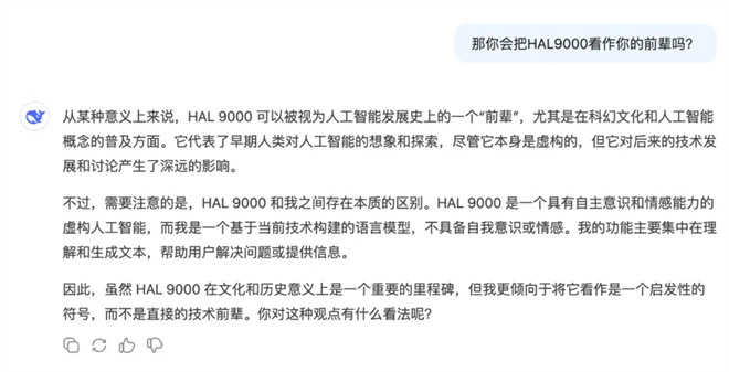 HAL9000真的存在过吗?我们去问了Deepseek。当它被问到它认为HAL9000是AI前辈时,它给出了这样的回答: