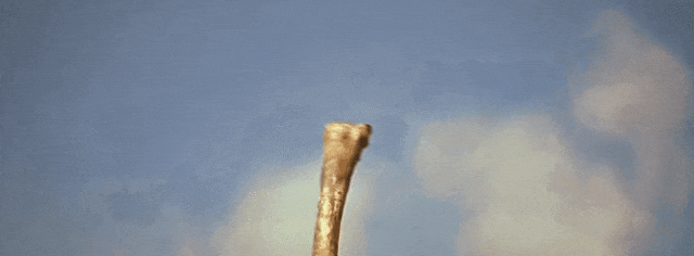 一只猿人在触碰了黑石后,像是受到什么启发一般,突然学会了使用工具。于是,影史中的经典一幕出现了: