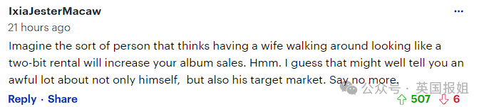 “想想那种觉得让自己老婆穿得像个廉价出租模特就能提升专辑销量的人吧。