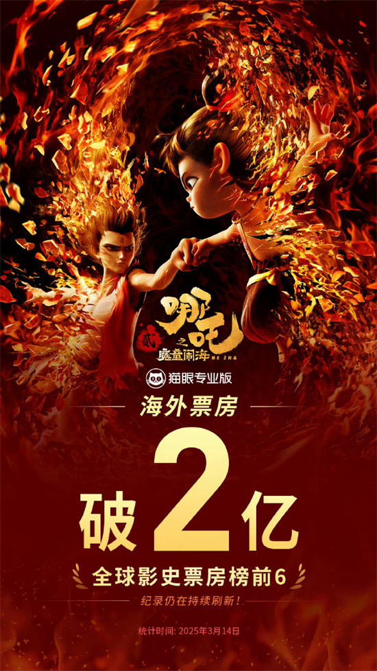 网站首页 影视资讯 动漫 科幻片 动作片 大陆剧 喜剧片 悬疑片 恐怖片 剧情片 战争片 微电影 网站首页 > 影视资讯 > 冲击全球第五!《哪吒之魔童闹海》海外票房破2亿 冲击全球第五!《哪吒之魔童闹海》海外票房破2亿 2025-03-15 09:16 据网络平台数据,《哪吒之魔童闹海》海外票房突破2亿,截至当前全球票房(含预售及海外)已超149.79亿元,冲击全球票房榜第5位! 发表 更多评论 最新资讯 查看更多