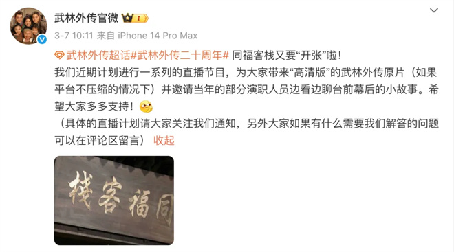 在《武林外传》20周年之际,官方也发布消息,将推出高清修复纪念版,策划情景短剧,开启直播盛典等一系列活动,继续开掘武林外传的IP价值。