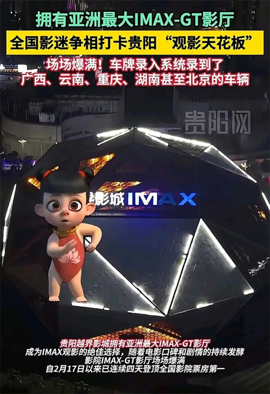 全国多家电影院也迎来了自己的春天。比如拥有全亚洲最大IMAX-GT影厅的贵阳越界影城被《哪吒2》盘活,直接拉动贵阳IMAX票房登顶全国榜首,全国影迷为一块大银幕赴一座城。