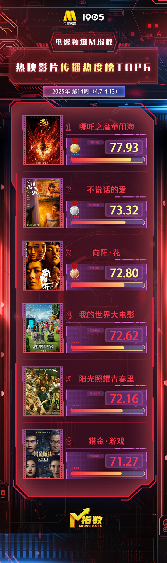 电影频道M指数2025年第14周结果发布。4月7日-4月13日,电影频道M指数热映影片传播热度榜前6位依次为: