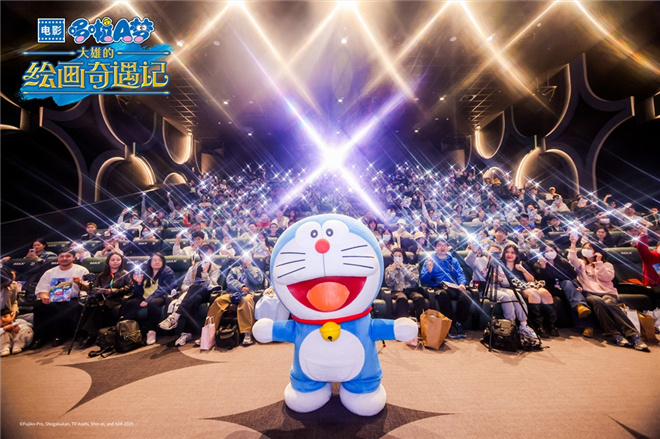 影片放映结束后,在观众热烈的欢呼声中,哆啦A梦以憨态可掬的形象惊喜登场。它热情地伸出圆手,向在场观众亲切打招呼:中国的朋友们大家好,我是哆啦A梦,很高兴跟你们见面。看到大家这么高兴,我也非常开心,希望接下来能与大家度过一段愉快的时光。