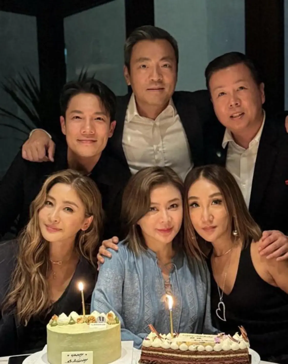在派对现场,众人围坐在两个精美的蛋糕前,一个是抹茶口味,另一个是巧克力口味。关之琳作为寿星,坐在前排中间的位置,笑容满面地接受着朋友们的祝福。