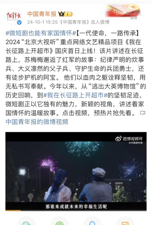 《我在长征路上开超市》是由北京市广播电视局指导、十月初五影视出品制作的首部长征题材奇幻主旋律短剧。此前,该剧入选了广电总局的国庆档微短剧片单,以及2024“北京大视听”重点网络文艺精品项目。