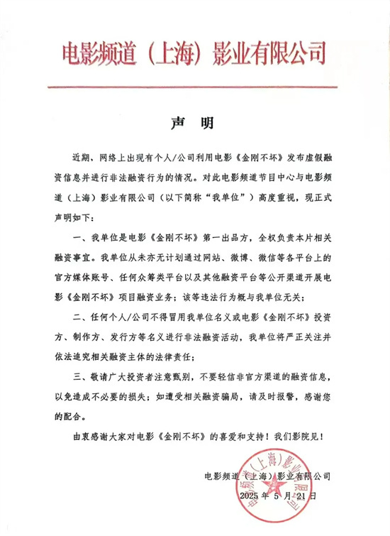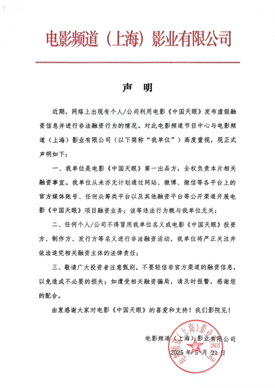 近期,网络上出现有个人/公司利用《中国天眼》《金刚不坏》发布虚假融资信息并进行非法融资行为的情况,电影频道在此声明,我中心下属电影频道(上海)影业有限公司是电影《中国天眼》《金刚不坏》第一出品方,全权负责本片相关融资事宜,敬请广大投资者注意甄别,所有融资信息都以官方发布的为准。