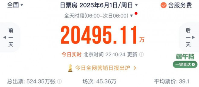 据票务平台显示,截至6月1日22时10分,2025年六一儿童节票房超2.04亿,超昨日端午节票房成绩!