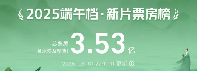 截至发稿,2025端午档累计票房已超3.53亿。(含点映和预售)