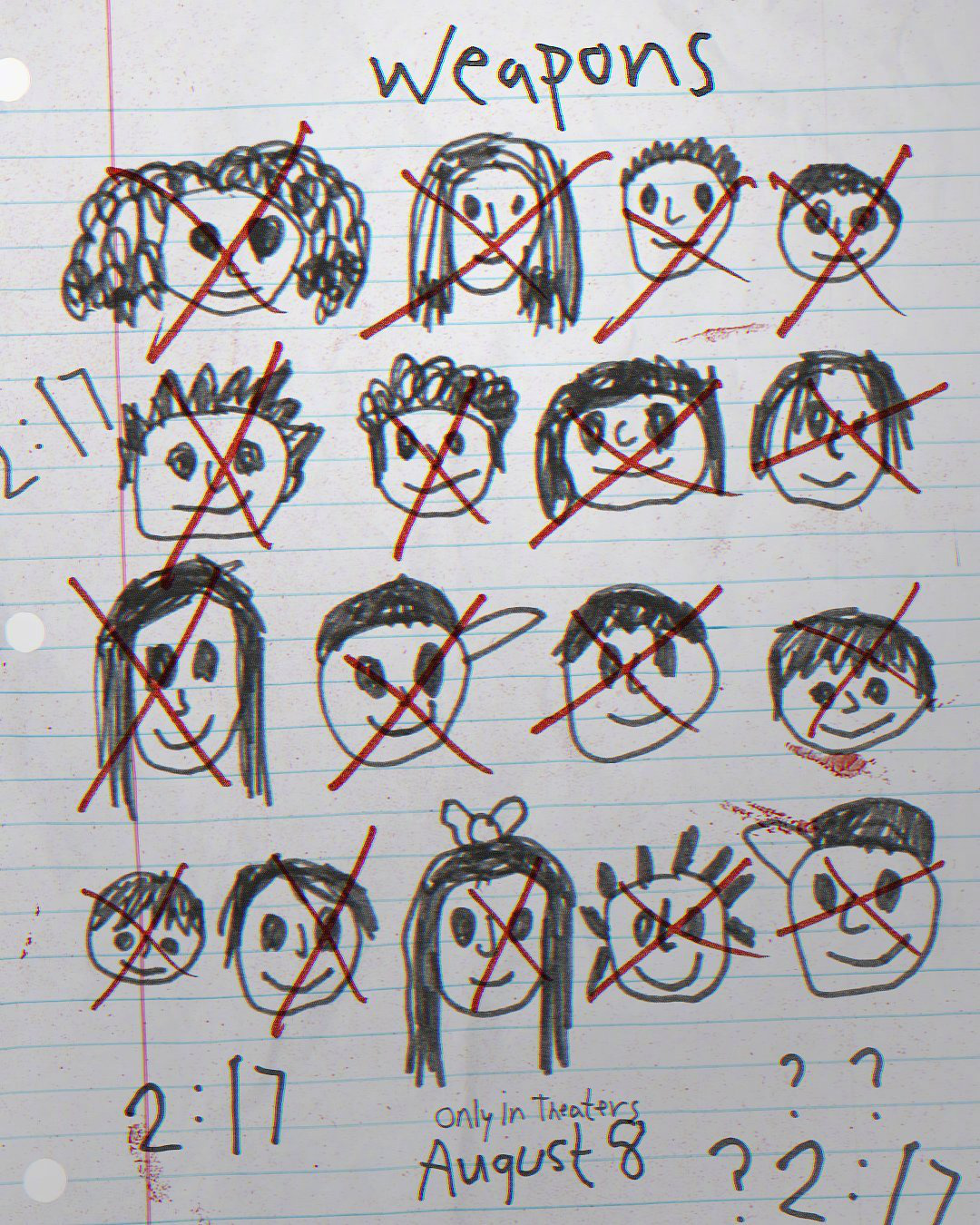 日前,由《野蛮人》导演扎克克雷格自编自导的恐怖片《武器》(Weapons)发布海报,一张练习纸上画着消失孩子的画像,17个孩子在凌晨2:17神秘失踪,每个孩子的头像上还被画上了红色的×,这幅画出自谁手?