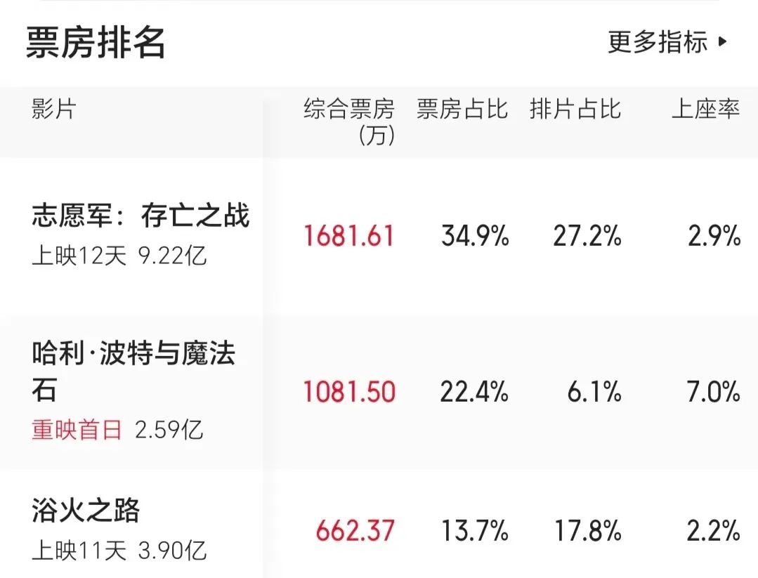 10月11日重映首日,《哈利·波特与魔法石》票房突破1000万。但更值得业内关注的一组数据是,由于重映片可排映厅量的限制,《哈利·波特与魔法石》的排片仅有6.1%,但却贡献了22.4%的票房。而在《志愿军:存亡之战》的路人观众没有大规模进场之前,它撬动的票房更是达到了惊人的34.7%。