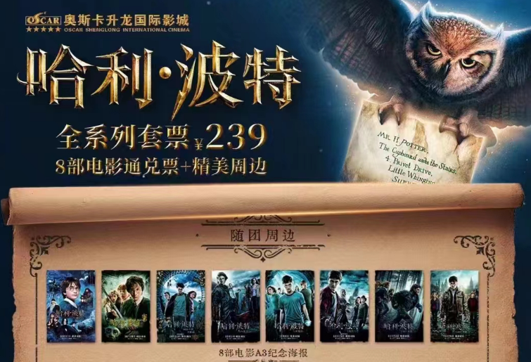 娱乐独角兽注意到,不少院线早在国庆假期前就开启了《哈利·波特》全系列八部套票预售。根据所在城市不同,这些套票的价格大多在239元至398元之间不等。有影院给前100位购票的观众,准备了8部电影的A3纪念海报;有影院让所有观众都现场抽奖,凭运气能否获得海德薇徽章、哈利·波特与泡泡玛特联名盲盒、死亡圣器挂链、哈利·波特官方文件夹等精美礼品,是“麻瓜”还是“魔法师”只在一瞬。
