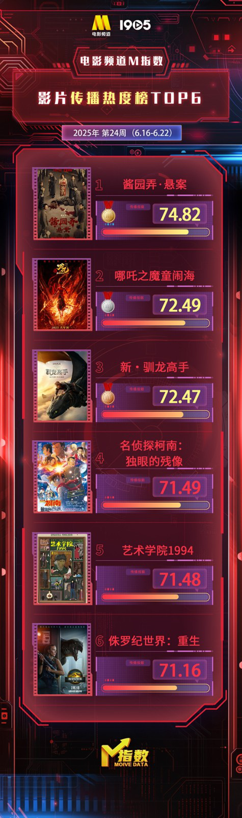 电影频道M指数2025年第24周结果发布。6月16日-6月22日,电影频道M指数热映影片传播热度榜前6位依次为: