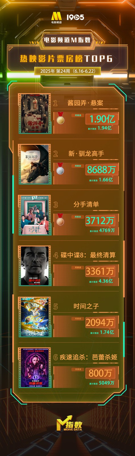 电影频道M指数2025年第24周结果发布。6月16日-6月22日,电影频道M指数热映影片票房榜前6位依次为:
