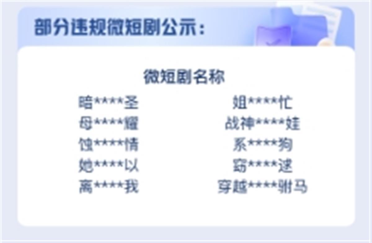 部分违规微短剧账号也被公示,如:甜****天、麒**剧、红**场、杏**剧、青**场、邻****事、风**看(好*版)、奇**刻、赐**剧、每**场。