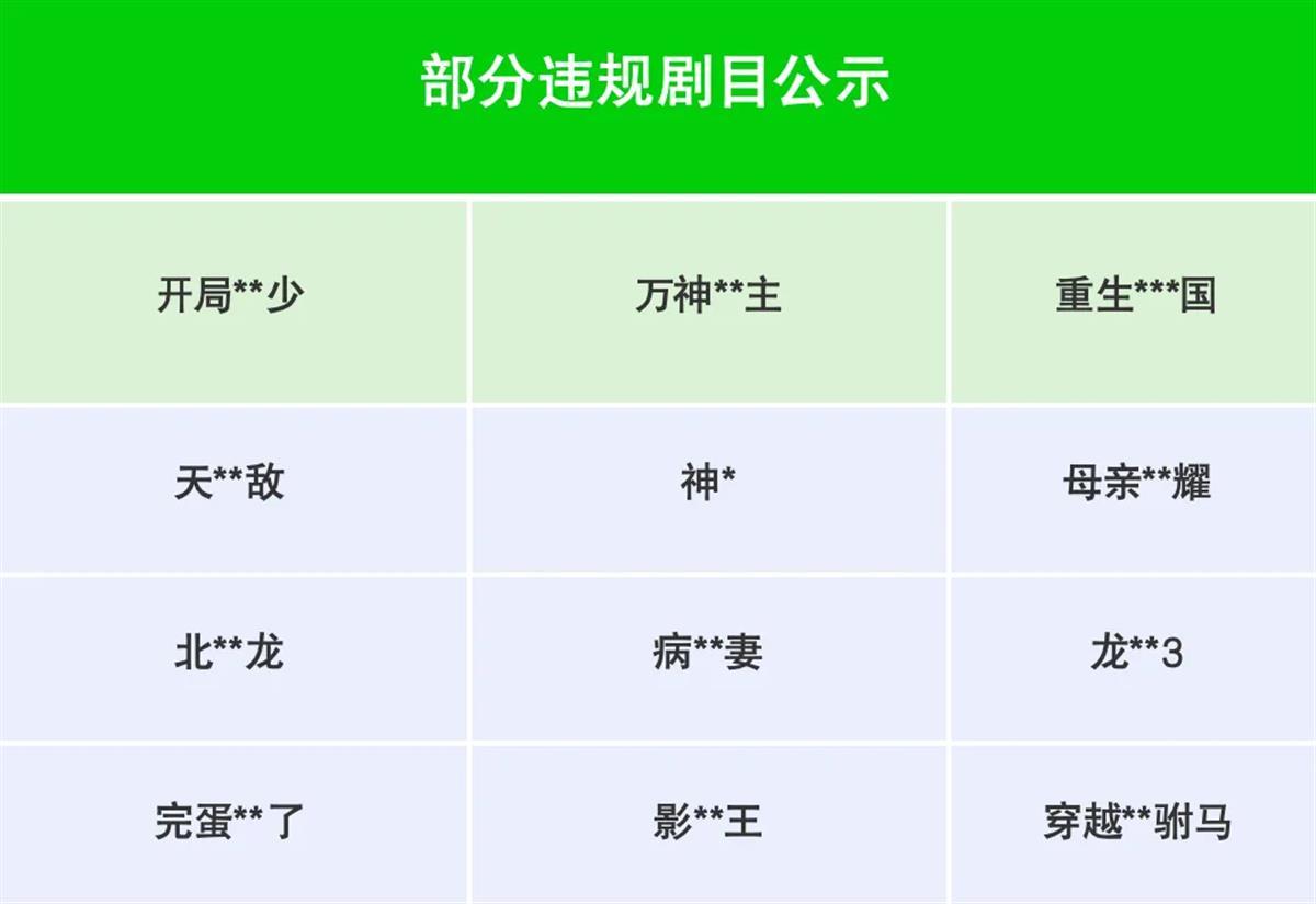 《逍遥圣手》,违规原因:存在内容低俗、价值导向不良等违规情况;《烈火归途》,违规原因:存在宣扬虐待未成年人、价值导向不良等违规情况;《扬刀跃马》,违规原因:存在宣扬暴力行为、展示血腥画面等违规情况。