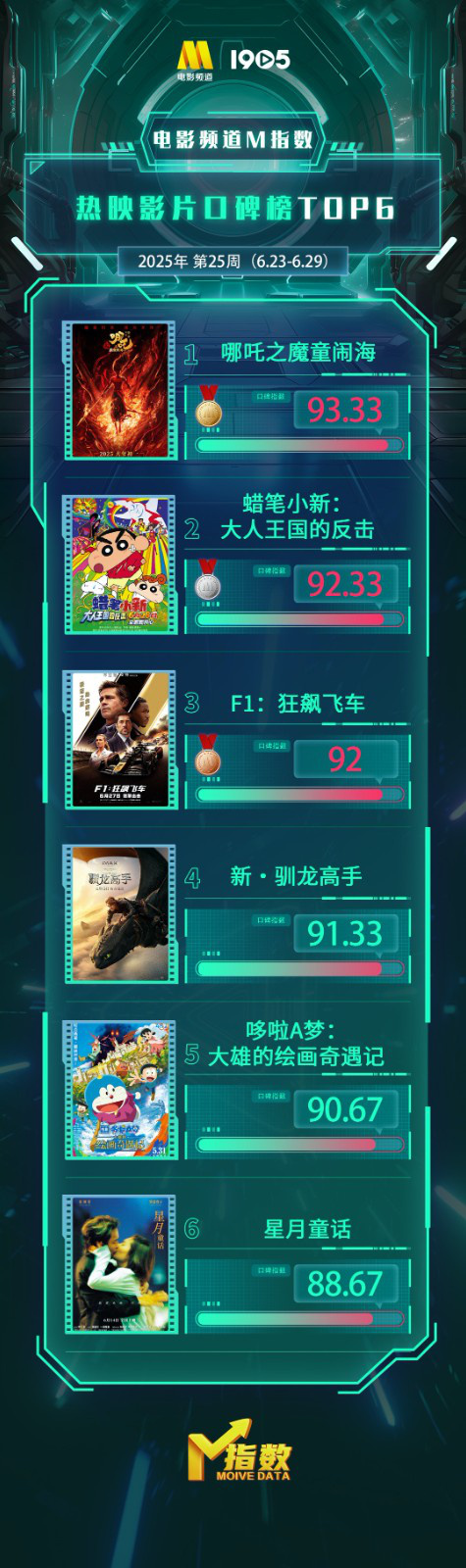 电影频道M指数2025年第25周结果发布。6月23日-6月29日,电影频道M指数热映影片口碑榜前6位依次为: