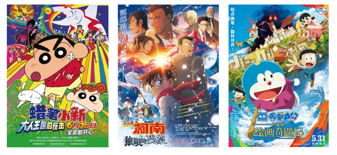 近期上映的《名侦探柯南:独眼的残像》《蜡笔小新:大人王国的反击》以及《哆啦A梦:大雄的绘画奇遇记》三部日本经典IP的动画电影同台竞技,票房表现亮眼。