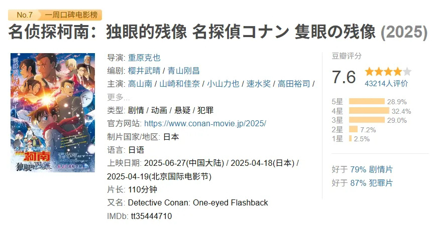 其次是人和。《名侦探柯南:独眼的残像》在日本上映时已取得优异的票房和口碑,豆瓣评分高达7.6分,为近年来柯南系列电影的最高口碑。这种提前释放的良好口碑吸引了更多中国观众走进影院。