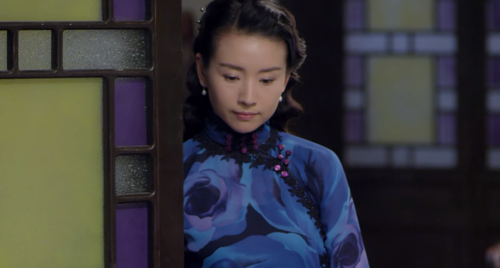 蓝黑配合的旗袍很容易显老气,但穿在董洁身上,却有种独特的妩媚,一抬眼,完全被她给迷住了。