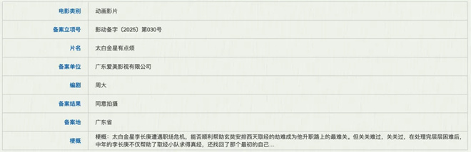 《食南之徒》将同步开发剧影,电影版则将由《满江红》编剧陈宇执笔;《长安十二时辰》影版也正式立项;《太白金星有点烦》也将改编成动画电影。