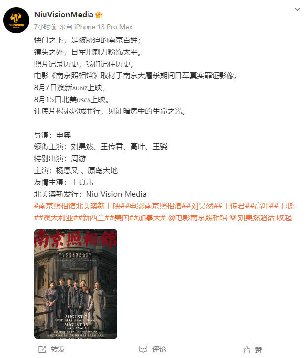 2025暑期档电影《南京照相馆》近日宣布海外多地定档,将于8月7日在澳大利亚、新西兰地区上映,8月15日在北美地区上映。影片已于7月26日在中国大陆地区上映,截至目前,影片累计票房已达到4.64亿元。