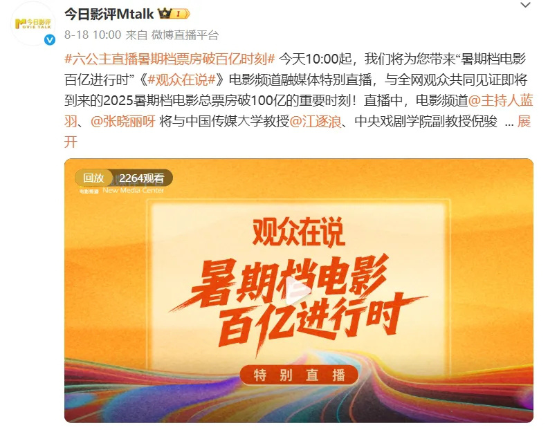 暑期电影频道融媒体特别策划了近20场《观众在说》观影口碑直播节目,进一步放大观众声量。观众手握更具主体性的决策权重回电影的中心位置,从观看者蜕变成驱动电影创作和电影走向的核心力量。