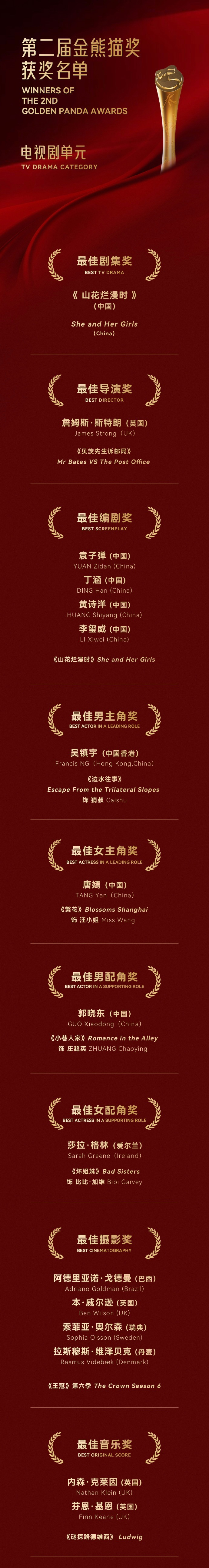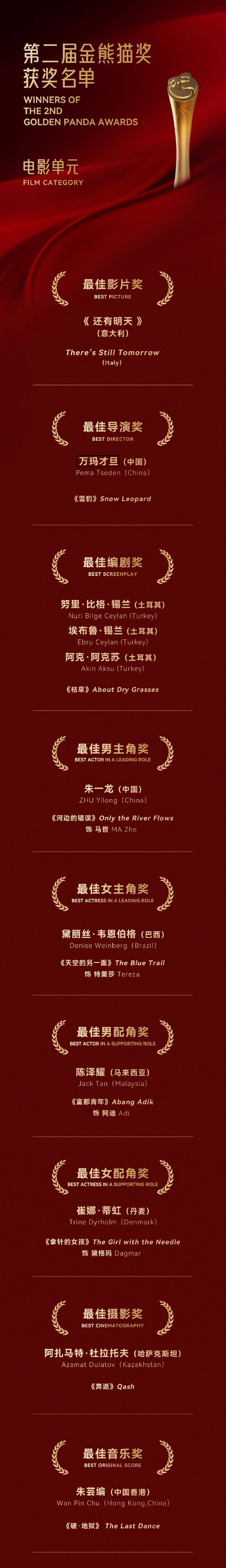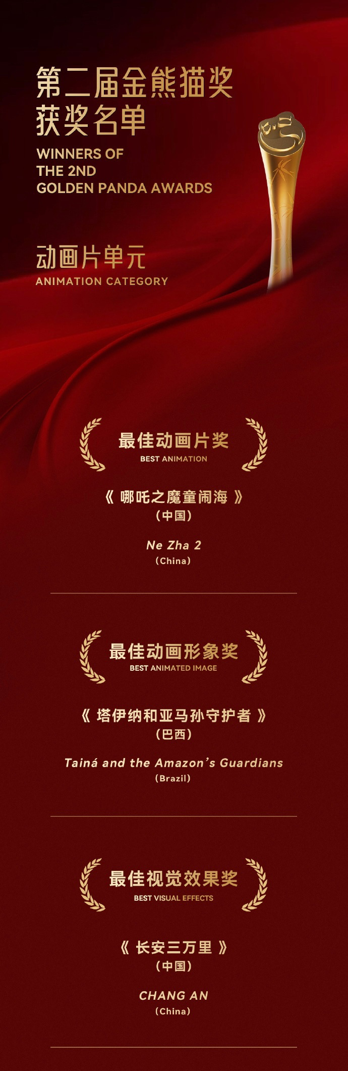 9月13日,第二届金熊猫奖在成都揭晓。其中,在电影单元,《还有明天》获最佳影片奖,朱一龙凭借《河边的错误》获最佳男主角奖,黛丽丝韦恩伯格凭借《天空的另一面》获最佳女主角奖。在电视剧单元,《山花烂漫时》获最佳剧集奖,吴镇宇凭借《边水往事》获最佳男主角奖,唐嫣凭借《繁花》获最佳女主角奖。在动画片单元,《哪吒之魔童闹海》获最佳动画片奖。