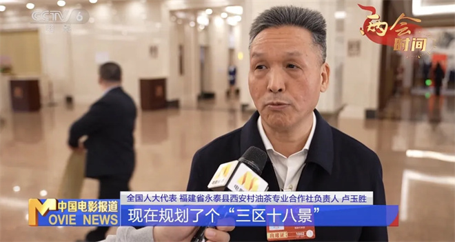 全国人大代表、福建省永泰县西安村油茶专业合作社负责人卢玉胜介绍,村里规划了三区十八景,主要打造油茶旅游特色小镇。如果能够实现"电影+文旅+养生+美食"的融合发展,肯定能够带动一方经济发展。
