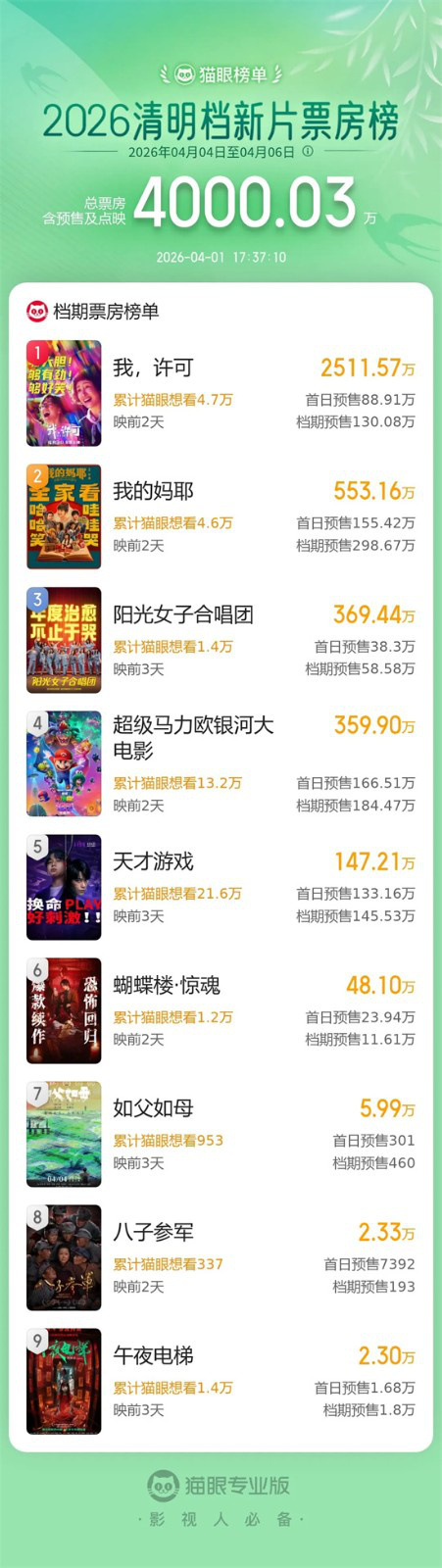 据票务平台数据显示,截至4月1日17时37分,2026年清明档新片预售总票房破4000万,《我,许可》《我的妈耶》《阳光女子合唱团》暂列清明档新片预售票房榜前三位。