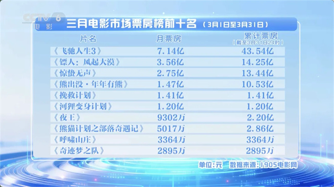 春节档影片《惊蛰无声》、《熊出没年年有熊》同样是三月主力,月度票房分别为2.74亿元和1.37亿元,夺得第三、第四名。