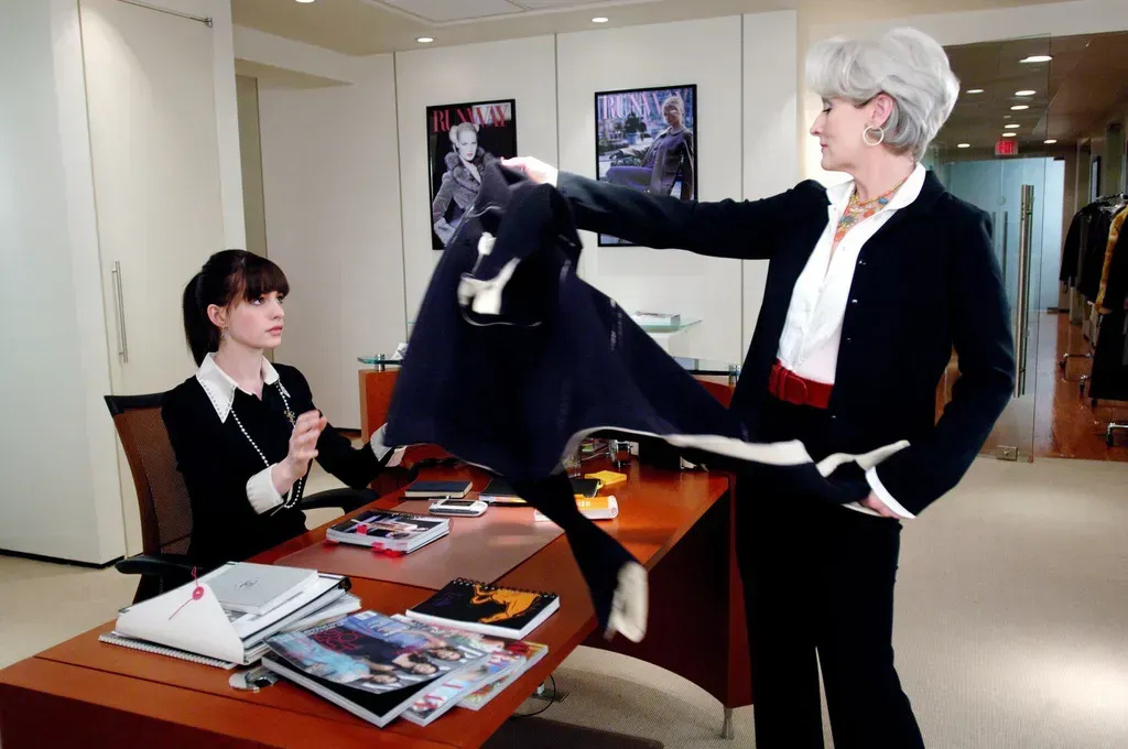 梅利尔斯特里普饰演的时尚杂志主编米兰达,一头标志性的银发、恰到好处的配饰,简直是顶级高智感穿搭的教科书。