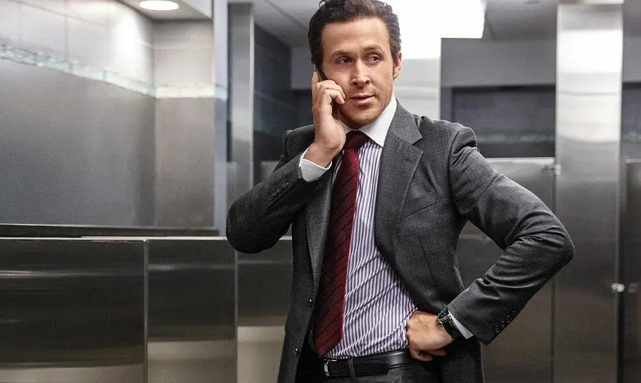 瑞恩高斯林在《大空头》里饰演的贾里德韦内特展现了一种锋利且狂妄的智感。他穿着剪裁极其精密的华尔街西装,梳着一丝不苟的发型,在众人皆醉时清醒地盯着崩盘的数字。这种气场是带有攻击性的,是电影中脑力即财力的完美代言。