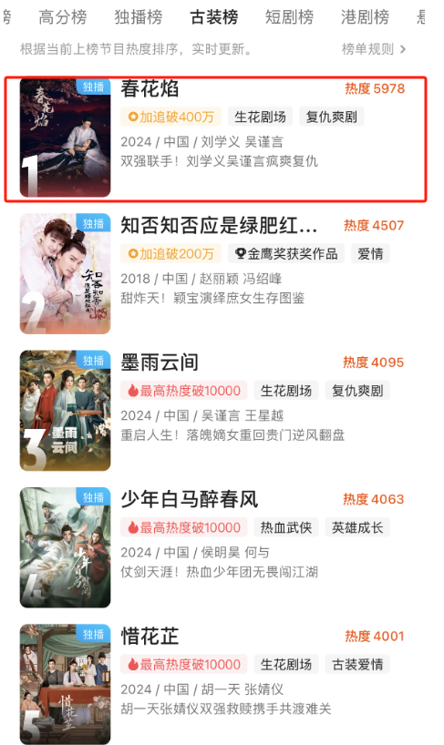 古装复仇爽剧《春花焰》(原名《春华厌》)上线优酷,首播2集拿下站内热榜第一。