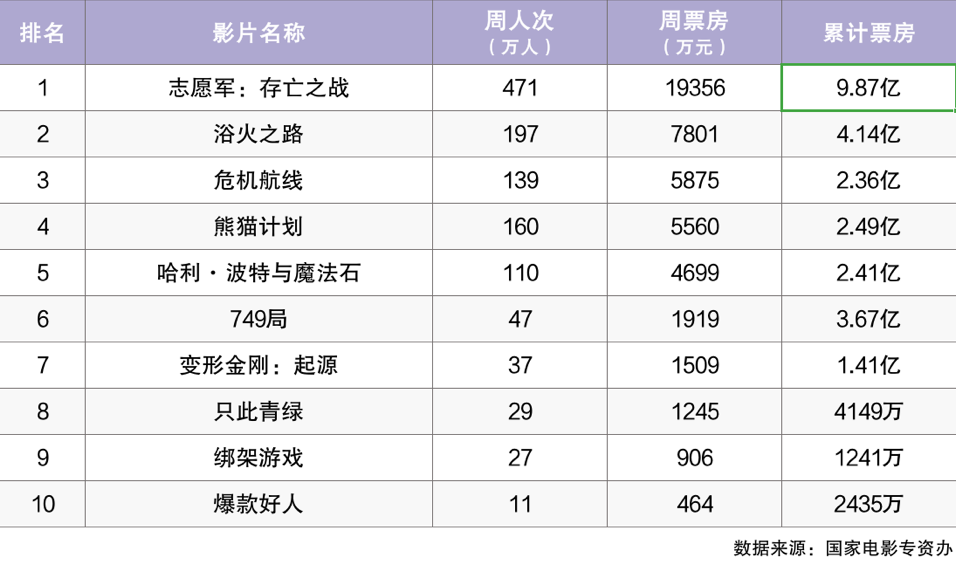 由陈凯歌导演的《志愿军:存亡之战》在周票房榜上排名第一,上周共收获票房1.94亿,该片自上映以来已蝉联13天日票房榜冠军,同时夺得2024年国庆档票房冠军和人次冠军,累计票房9.87亿。