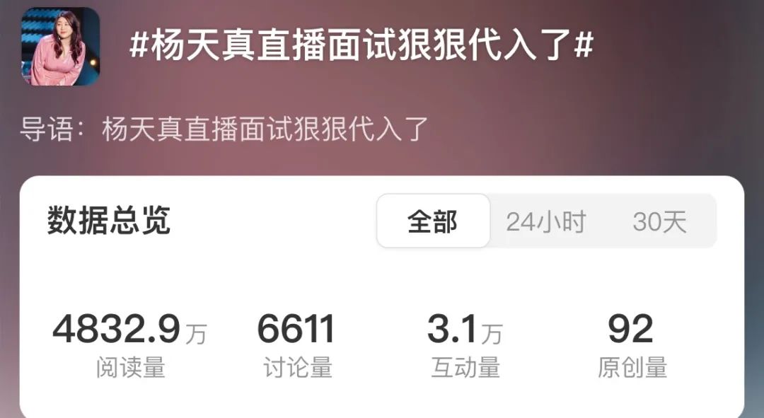 以李诞直播间为例,从今年4月开始在小红书直播经营“诞的小卖部”开始,李诞直播间4个月涨粉40万 ,最高在线人数4.4万;杨天真的两场“招助理”直播更是吸引80万人在线围观,话题#杨天真直播面试狠狠代入了#还频频出圈登上热搜榜一。