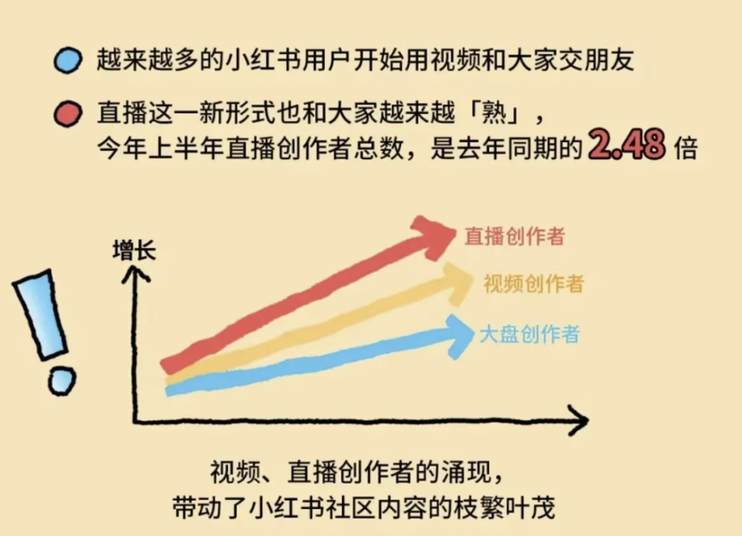 而从创作者端来看,平台战略对直播业务的拉动效果是显著的。数据显示,今年上半年,小红书直播创作者增速高于视频创作者和大盘创作者的增速,小红书直播创作者总数增长2.48倍,小红书视频偏好创作者总数增长1.43倍。