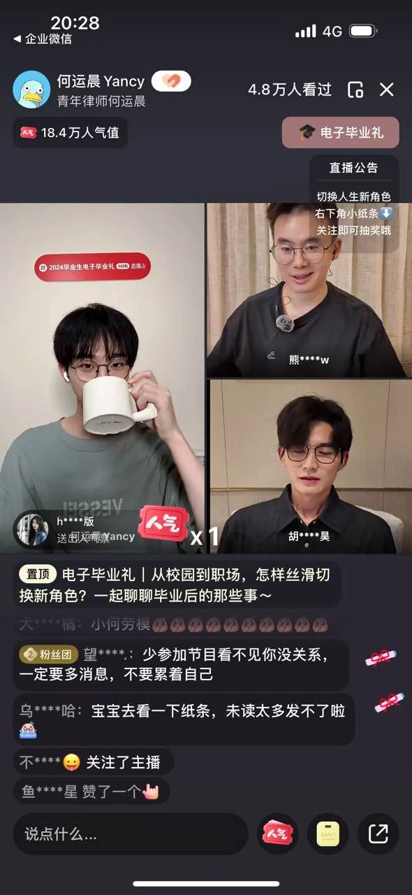在过去的毕业季和秋招中,以杨天真、Rocco刘冲、何运晨为代表的“职场进阶派”直播间频频出圈。最吸引年轻人的是何运晨的直播间,其在职场综艺中的高情商表现,以及与求职大学生相对接近的过来人身份,让大学生们涌进直播间。