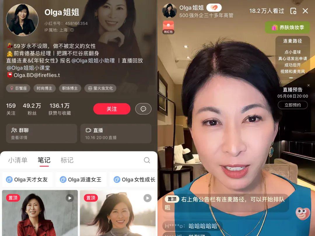 直播的四个月时间里“Olga姐姐”涨粉20万,是过去5年的粉丝积累的总和,并成功发展出直播间的广告变现模式,让这位曾经的“广告女王”在小红书直播间里找到事业新方向。