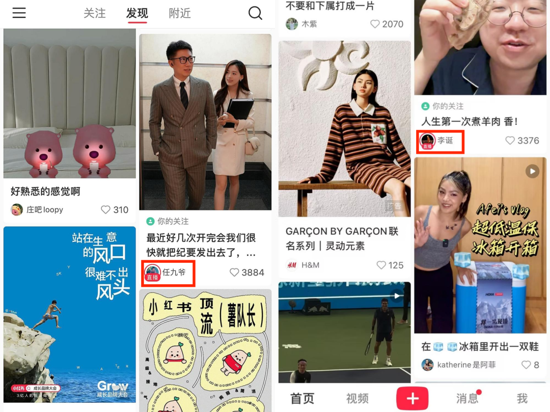 应用页面的变化更加直观。打开小红书,内容直播已经和图文、视频笔记一起融入小红书主页的双列流中,正在直播的主播头像会呈现“呼吸灯”,在所有场域透出,这也会进一步吸引用户注意,点进创作者主页观看直播。