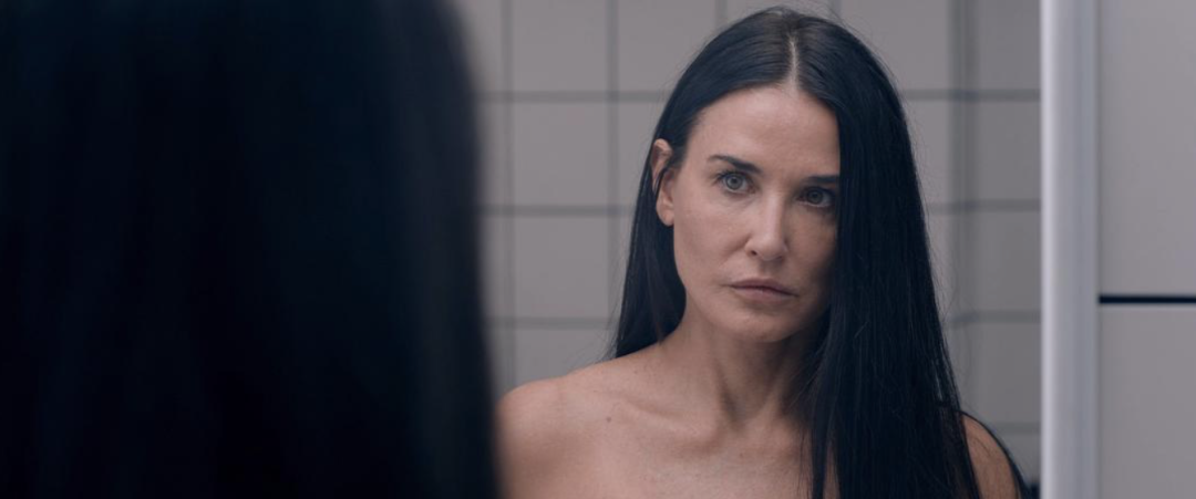 对比《某种物质》里女主角电影明星伊丽莎白在容颜衰退后冒险接受「某种物质」的改变,却在青春貌美如花和加速衰老变异成怪物两条路上同时狂奔的剧情,黛米·摩尔几乎就是这个角色的活活体样本。