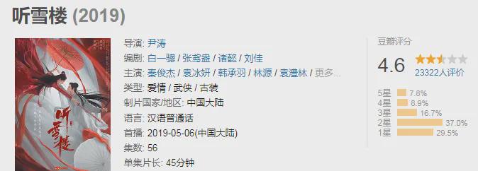 再看《听雪楼》,沧月小说中的大热门,被人称之为“最美江湖传说”,结果影视剧一改编,豆瓣评分4.6分,当时男女主分别是秦俊杰和袁冰妍,暂且算作选角事故,咖位不够。