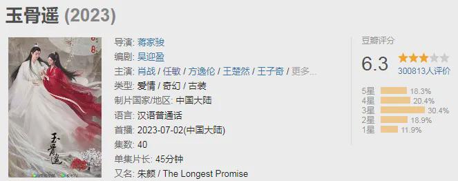 后来《朱颜》也改编成剧了,就是大名鼎鼎的《玉骨遥》,男女主分别是流量咖肖战和话题颇高的任敏,本以为这次总不会有问题了吧,结果豆瓣评分6.3,有理由怀疑,评分能及格靠的可能是肖战粉帮忙。