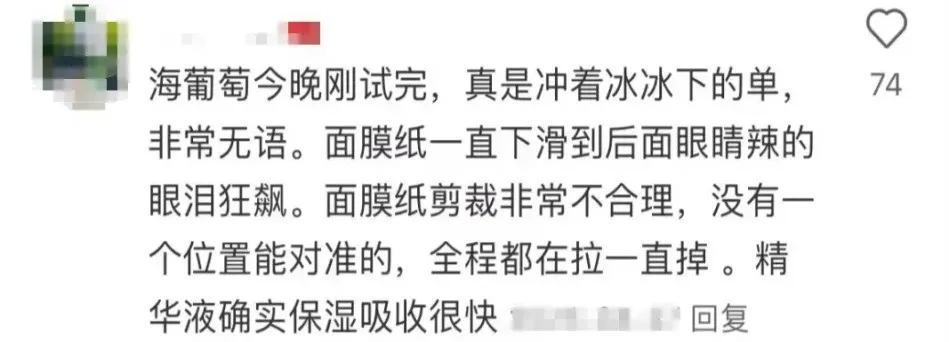 还有人吐槽:“精华液到处淌,只能躺着敷,电视都看不了,流进眼睛里痛得睁不开,硬生生闭眼适应了十多分钟才敢睁开。”