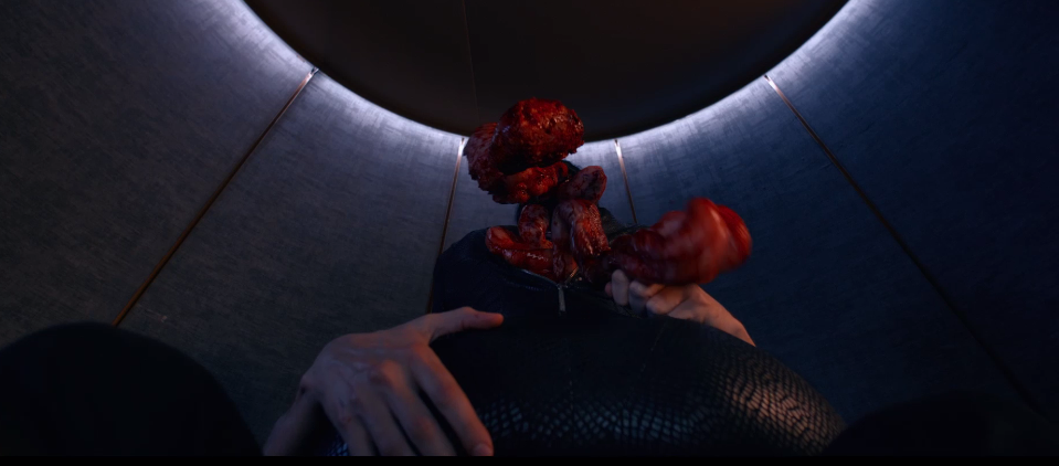 畸形怪物登台后,朝着台下观众吐出了一坨他们最想看的部位。