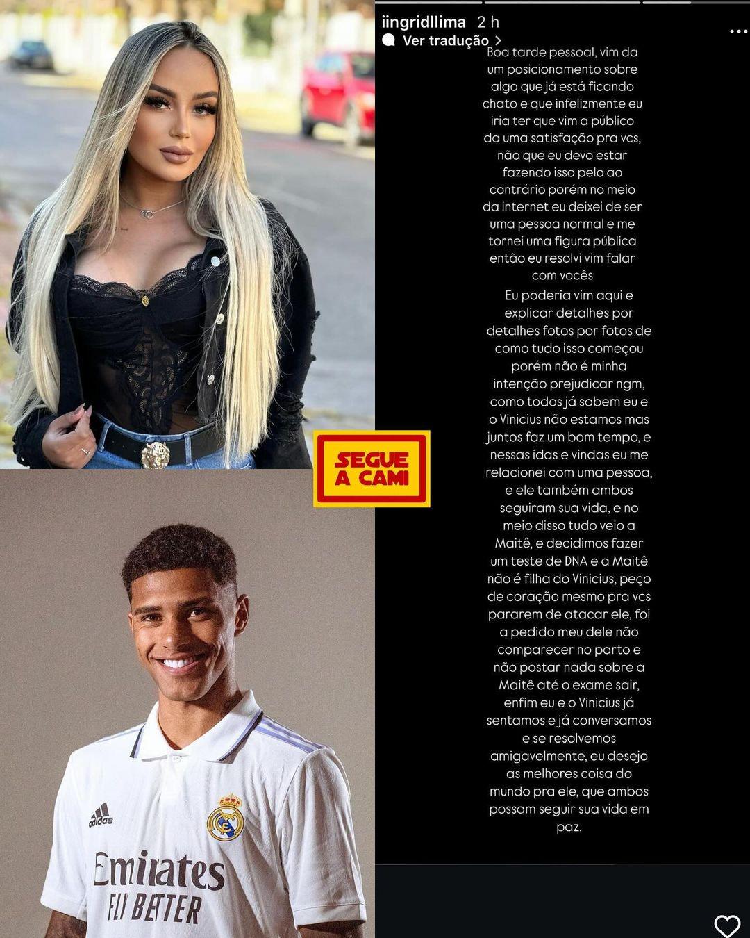 随后,他的前妻英格丽德-利马在社交媒体上发文,她写道:“正如大家所知,我和维尼修斯-托比亚斯已经分开很长一段时间了,在这期间我和另一个人有过交往。在女儿出生后,我们决定做DNA检测,结果显示玛伊特并不是维尼修斯-托比亚斯的女儿。”