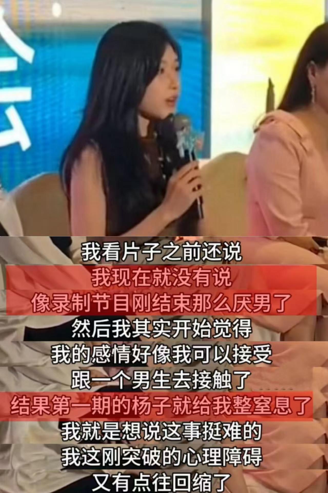还有王睡睡看了《再见爱人4》第一期后,“厌男症”又开始发作了,本来已经突破心理障碍,要跟一个男生处处的,这一下又给整窒息了,不敢谈了。