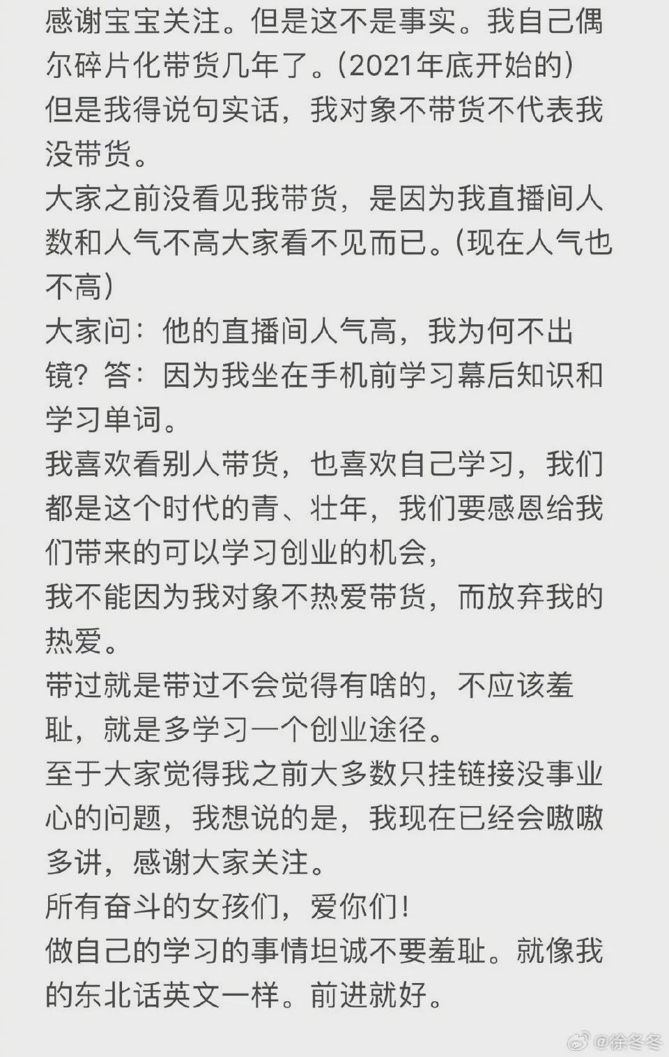 而且她还表示“我对象不带货,不代表我不带货。”对徐冬冬来说,带货是创业的一种形式。